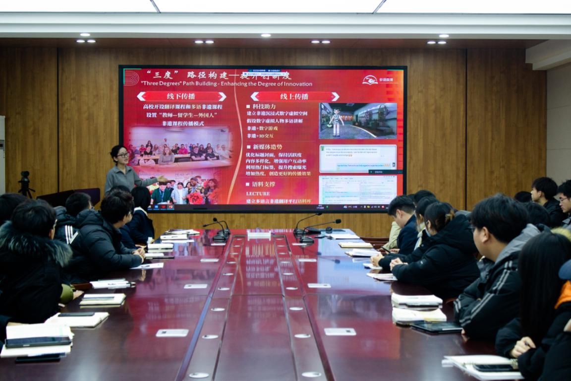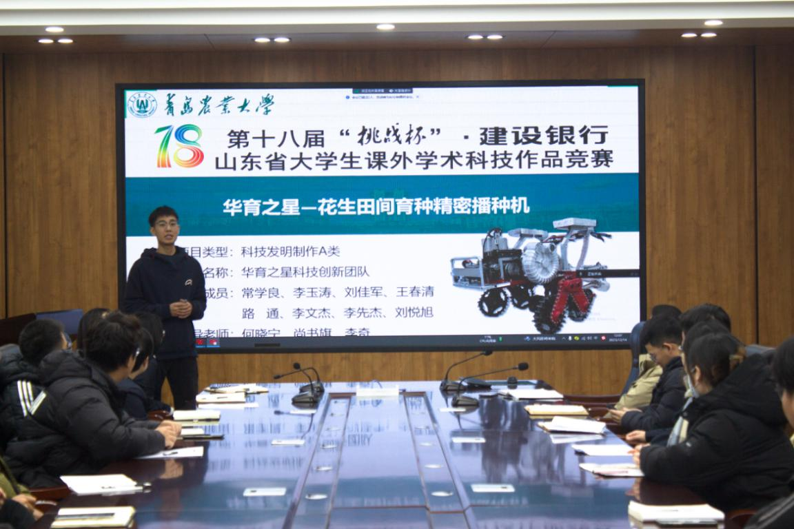 首先,孙梦迪以《多语荟遗 声贯中西:文化数字化战略背景下中国非物质文化遗产的跨文化传播研究——以山东省39个非遗为例》为题,汇报讲述了团队与20所国内外高校共建26门实践课程,完成多语翻译文本10万字、构建起25万余字的多语语料库,设计39项非遗的多语数字化展示模型、H5介绍页面和多样的非遗游戏,在国外购物平台上出售非遗文创,用外语讲好非遗故事,推动中华优秀传统文化走向世界舞台。随后,李先杰以《华育之星——花生田间育种精密播种机》为题,详细汇报了该项目团队致力于突破花生育种周期长、人工作业误差大的难题,融合适应花生田间育种的速充、净清技术、基于稳流态的气吸式花生精密播种技术、基于北斗导航的小区行长精确控制三大技术,研发了全国首台具有自主知识产权的国产化花生田间育种精密播种机,形成了花生田间育种机械化技术体系,填补了国内花生育种精播设备空白,对促进我国的现代种业创新发展具有重要意义。与会同学纷纷表示,通过本次宣讲,大家对创新创业有了新的认识和启发,激发了自身的参赛热情,开创了创新思维视野。
