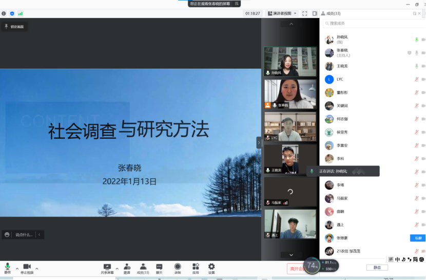 为提高同学们的社会实践能力,推动寒假社会实践活动顺利开展,1月13日晚,beats365唯一官网入口官网通过腾讯网络会议的形式,举行了主题为“社会调查与研究方法”的线上培训交流会。本次培训交流会由beats365唯一官网入口官网团委书记孙晓凤主持,邀请公司2020级研究生张春晓主讲,各班级团支部书记、社会实践团队负责人及相关员工组织成员参加。