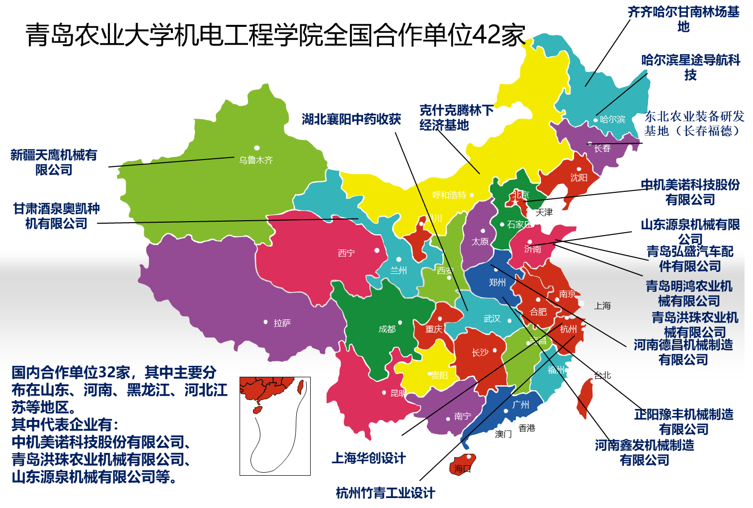 公司立足服务黄河重大国家战略,以“盐碱地上党旗红”特色党建品牌项目为引领,联合黄三角国家农高区注册成立黄三角智能农机装备产业研究院,全面完成了智慧农机创制园的引擎创新基地建设,协同16家单位联合启动实施盐碱地智能农机装备急需技术集成转化重大科创产“三百工程”,已突破纵横复合精细苗床制备等9项核心技术,实现盐碱地智能农机从基础理论、关键技术、新型装备研发创制“创新链”的高效运行。此外,公司获批农业农村部盐碱地智能农机装备重点实验室、全省农业机械试验鉴定与技术推广基地、山东省新旧动能转换公共实训基地等6个科教产平台,累计开展技术服务326次,培训3万余人。联合国内42家行业研究院所与优势企业单位,深化产学研协同推进,与10余家单位签署技术装备研发制造合作协议,相关成果在21个国家地区以及30个省市大面积推广应用,年直接效益3亿元以上,农民增收54亿元,应用作业节支总额165亿元,形成了以人才链、教育链、创新链、产业链四链融合的智能农机装备产业创新发展模式。
