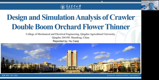 胡彩旗教授作题为“Design and Simulation Analysis of Crawler Double Boom Orchard Flower Thinner”的报告,探讨国内果园机械化疏花疏果作业需求和研究现状,基于多源信息融合,提出新型果园疏花疏果机械装备建设思路,实现精准疏花绿色作业,降低劳动强度,减少化学疏花对环境的影响,对缓解果园劳动力紧缺,实现现代有机果园高效、绿色的生产管理具有重要意义。