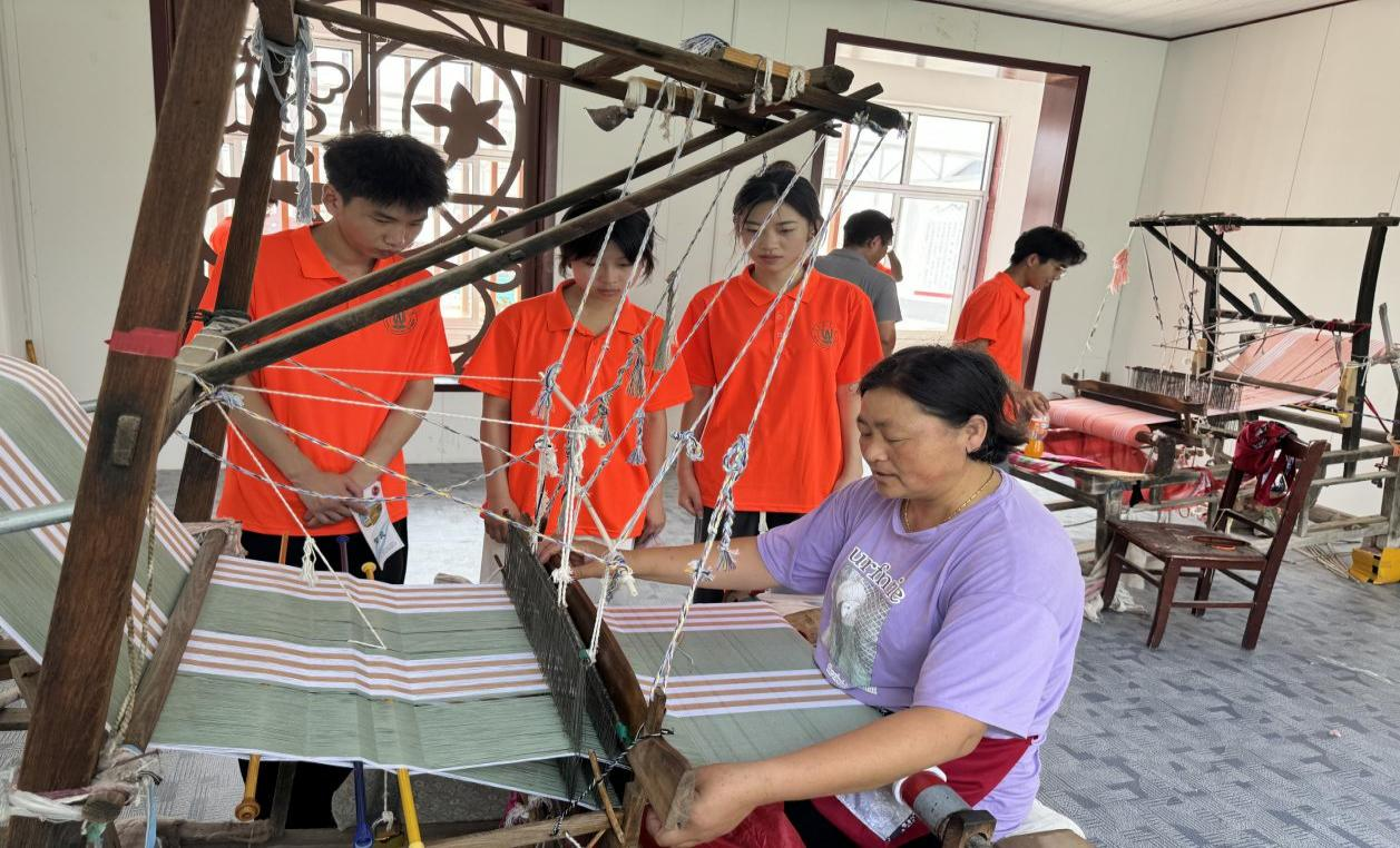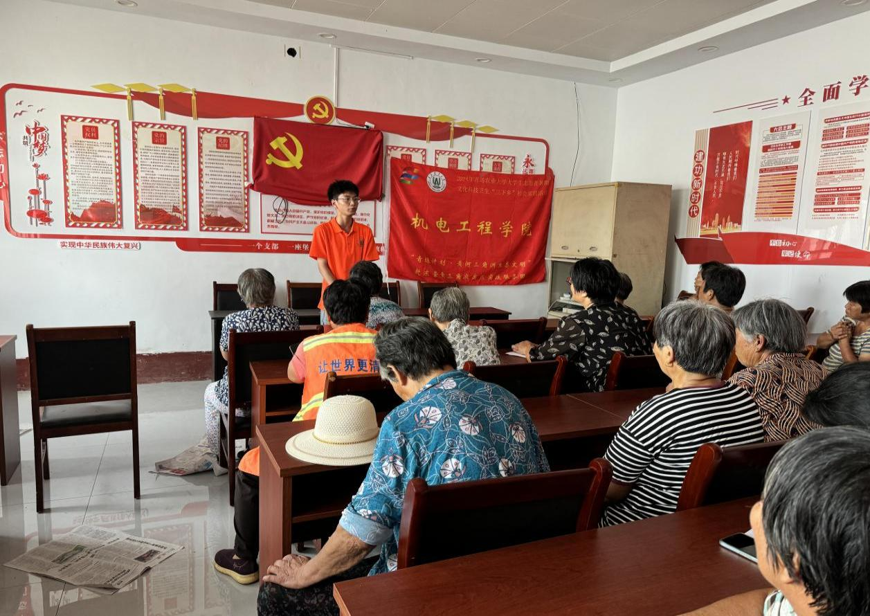 实践服务团前往马屋村和李屋村,举办了科普讲堂活动,宣讲员以通俗易懂的讲解方式,科普宣讲了有关黄河保护、生态文明建设、盐碱地农业发展等内容。在实践服务团宣讲员的讲解下,爱河护河讲文明、黄河保护治理、盐碱地农业生态高效等词组,在村民心中留下了深刻的印象。实践服务团还积极与村干部进行深入交流。李屋村支部书记李兴表示要始终秉持生态优先、绿色发展的原则,同时重视黄河流域传统工艺的文化传承。应李兴的邀请,实践服务团前往“汇绢纺”,深度体验黄河流域传统纺织布技艺,感受非遗文化之美,进一步加深了对木制纺织布器具的认识,并结合自身学科专业,提出了通过改良木质机械传动装置,使纺布生产效率得到提升的建设方案。