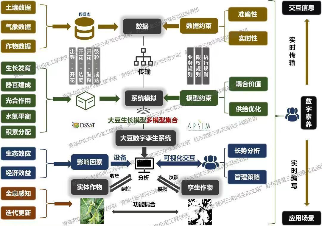 实践团总结过去两年盐碱地实地调研经验,并在去年盐碱地作物生态高效场景方案基础上,进一步将盐碱地智慧农业核心要素进行延伸。实践团紧密结合自身学科专业,以系统工程思维为根,形成了以功能模块搭建为干,以多个模型集合为枝,搭载大豆生长模拟模型和数字孪生系统,集成了全息感知、智慧决策、生态效益、迭代更新等功能为一体的“智·豆”应用场景方案。该场景方案将有效降低农业生产过程的环境污染和生态破坏等问题,为黄河三角洲盐碱地农业生态高效的发展,青春挺膺担当,共同守护壮阔黄河“生态绿”。