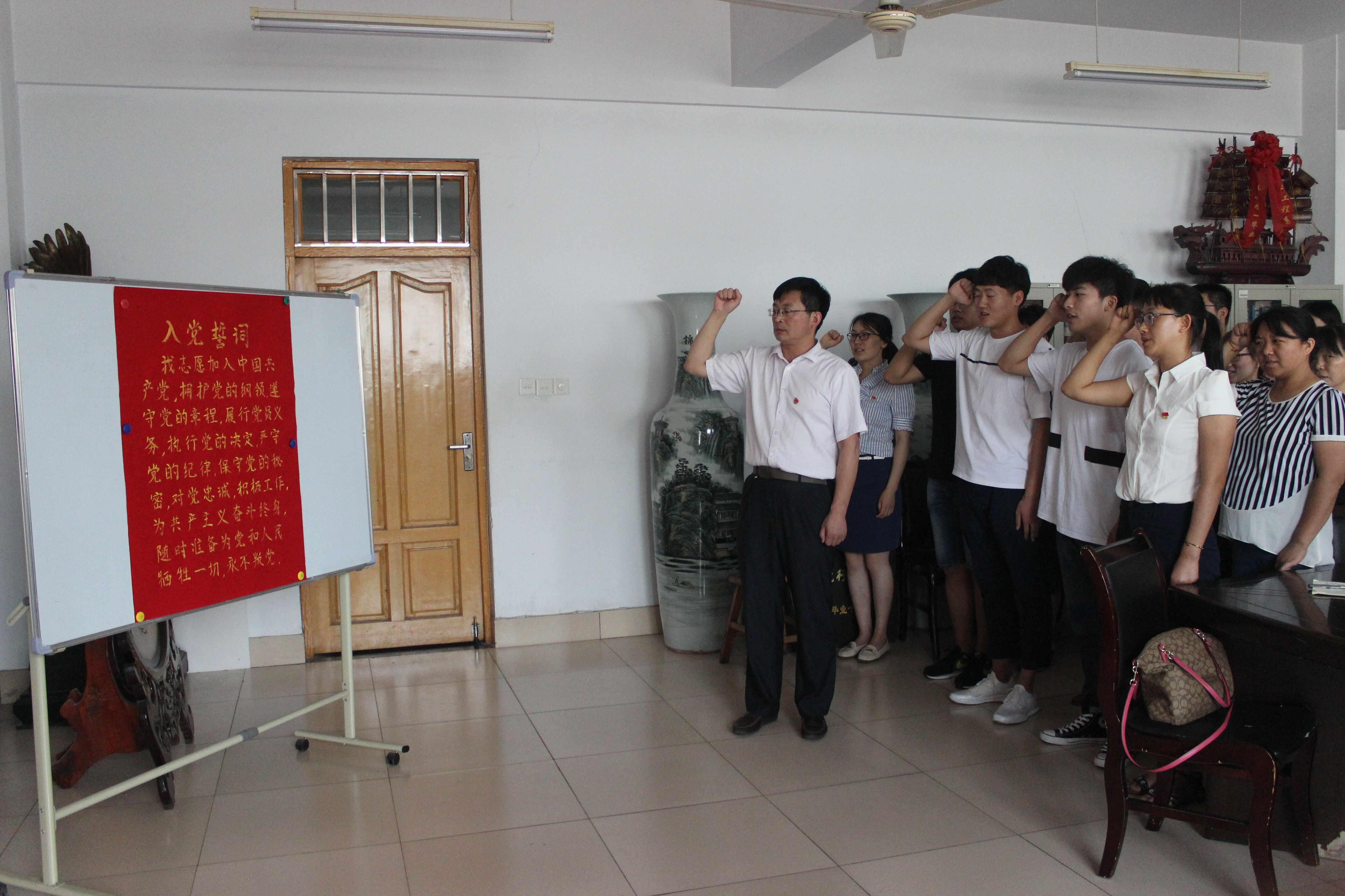 会上,全体党员面向党旗,庄严宣誓。预备党员代表于鑫鹏发言说:加入党组织是我们政治生命的诞生,也是我们人生中又一个新的起点。“组织上入党一生一次,思想上入党一生一世”,我们将以党员的标准严格要求自己,自觉地接受党员和群众的帮助与监督,团结和带领身边的同志,勤奋严谨,努力学习,奋发成才。