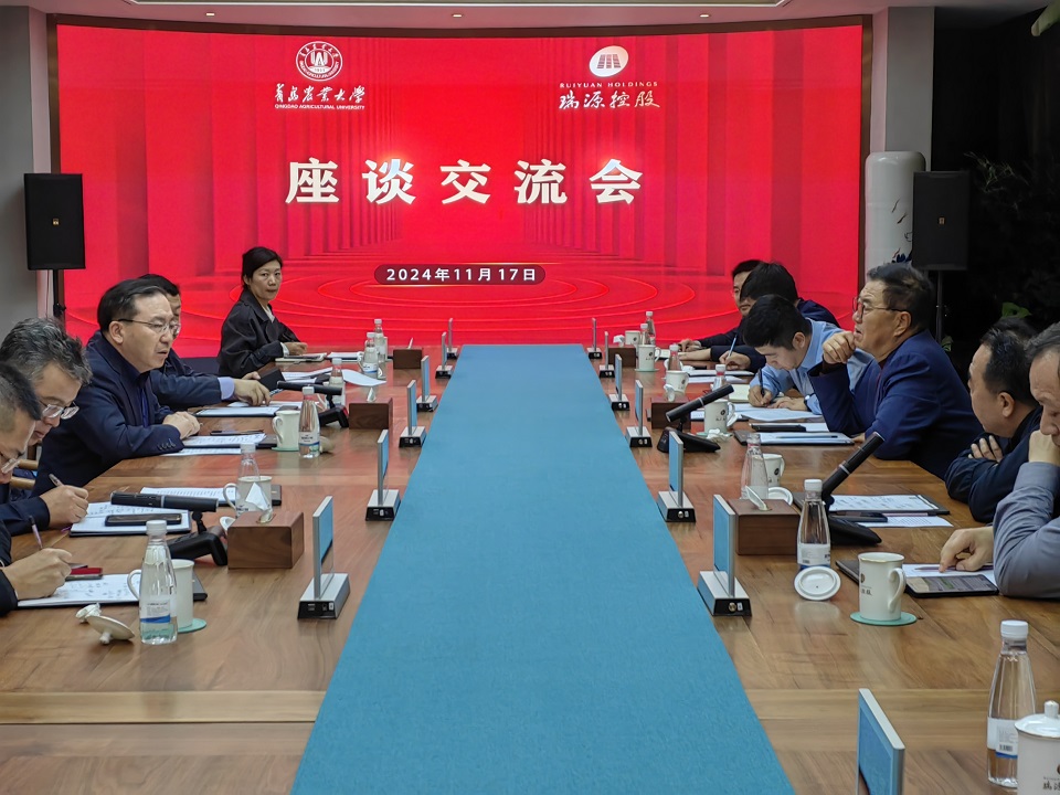 于瑞升对董事长赵金山一行到访表示欢迎,并介绍了瑞源控股集团“三大产业”和“六个板块”的相关情况,特别是在装备制造、大健康产业等方面的经验与做法,表达了依托公司学科优势和企业市场平台共同开展科技创新、人才引育、实验室建设等愿望和需求,希望双方在农机装备技术研发、农业科技人才培养、农业科技成果转化等方面开展全方位合作,加快推动科技进步与产业升级,实现校企双方高质量发展。