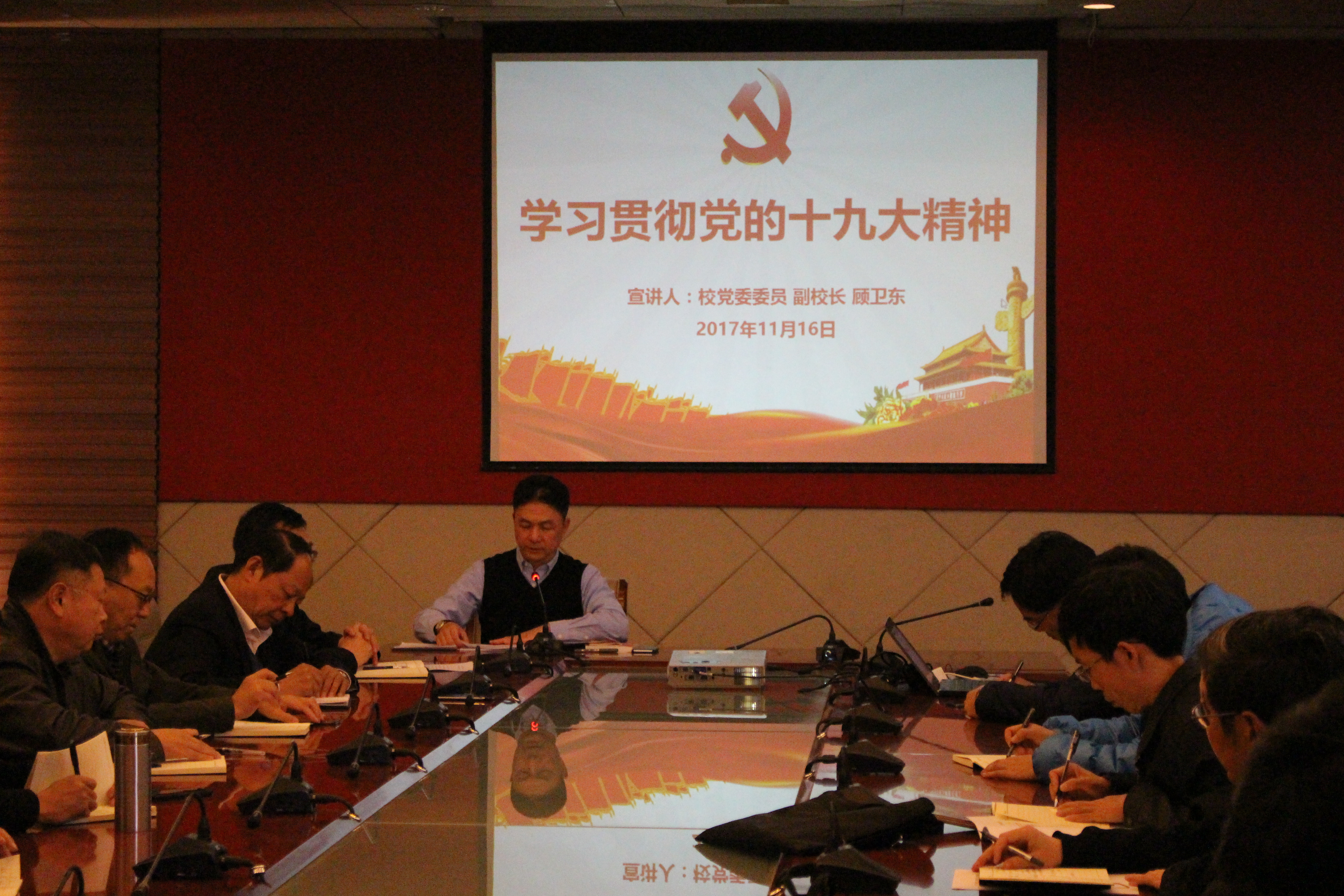 顾董事长从1、关于党的十九大的主题、主要成果;2、关于习近平新时代中国特色社会主义思想;3、关于过去5年的历史性成就和历史性变革;4、关于中国特色社会主义进入新时代;5、关于我国社会主要矛盾的变化;6、关于两个一百年奋斗目标的战略部署;7、关于我国经济社会发展重大战略部署;8、关于坚定不移推进全面从严治党等八个方面详细解读了党的十九大报告精神。同时又结合学习宣传贯彻党的十九大精神,就如何用习近平新时代中国特色社会主义思想武装头脑、指导实践、推动工作提出了四点要求:一是要正确理解立德树人的内涵;二是要坚持内涵发展,深化融合,积极推进双一流建设;三是学习十九大报告,要用哲学的观点去思考;四是要做好基层党组织建设,发挥战斗堡垒作用,落实五项重点任务。要按照公司党委的统一部署,带头学习十九大、带头宣讲十九大、带头贯彻十九大,先学一步、学深一层,学用结合、学以致用,为全体党员和师生作出表率和示范,以实际行动带动本单位的学习宣传贯彻工作,切实把思想和行动统一到党的十九大精神上来。